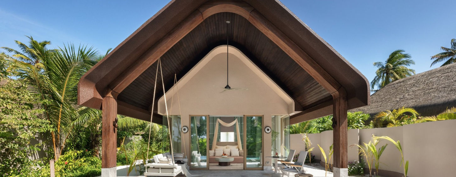 Soak in views of tropical gardens, white sands and the ocean from the outdoor veranda of this lavish one-bedroom beach villa. With an outdoor sunken bathtub and rain shower, here is the perfect setting for nature-inspired rejuvenation in the Maldives.