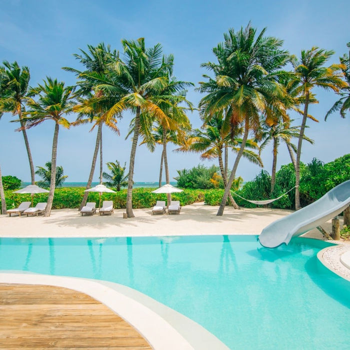 Unwind in a beachfront sanctuary featuring a private pool, water slide, spa amenities, and multiple bedrooms, offering ultimate luxury for families or groups.