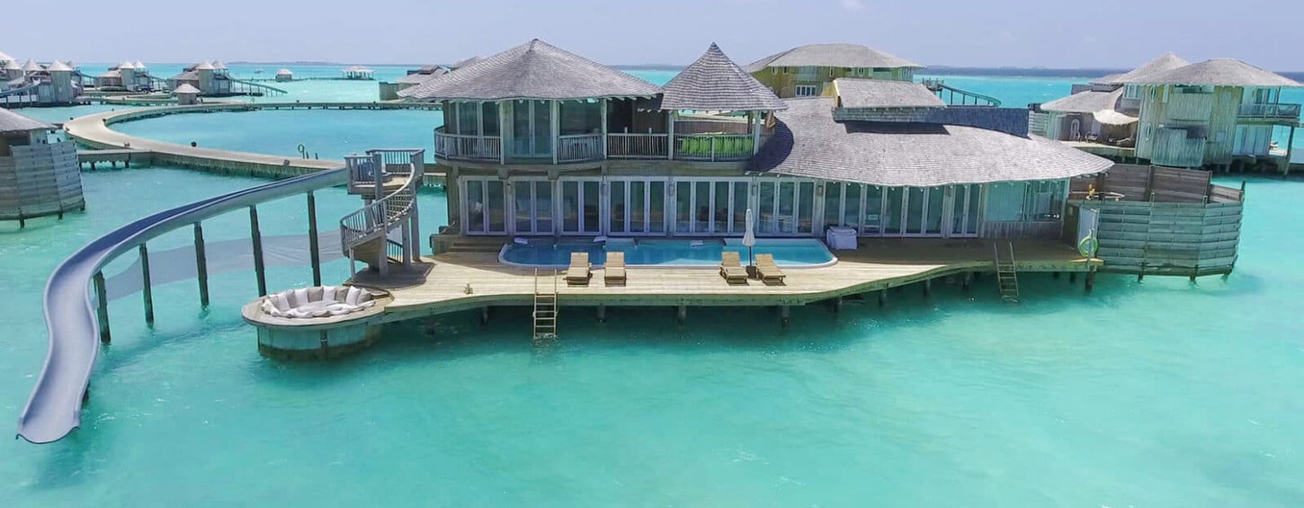 Spanning 5,597 sq.ft., the Two Bedroom Water Retreat with Slide offers a luxurious overwater escape with options for sunrise or sunset views. The villa’s ground floor features a spacious bedroom with a retractable roof, an ensuite bathroom with dressing room, and an outdoor shower and bath that open directly to the lagoon. Perfect for families, the ground floor also includes a children’s sleeping area, a cozy TV lounge, and a pantry with a minibar. Upstairs, the second bedroom boasts its own dressing room, bathroom, and an inviting seating area, alongside a covered dining sala. Relaxation abounds with catamaran nets, a saltwater pool, a sunken seating area, and a thrilling water slide. End the day with a choice from the wine fridge and enjoy sundowners as you unwind under the stars.