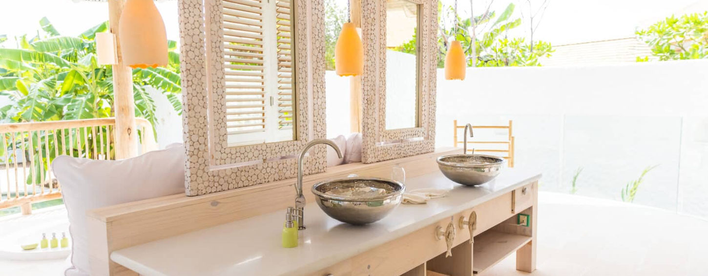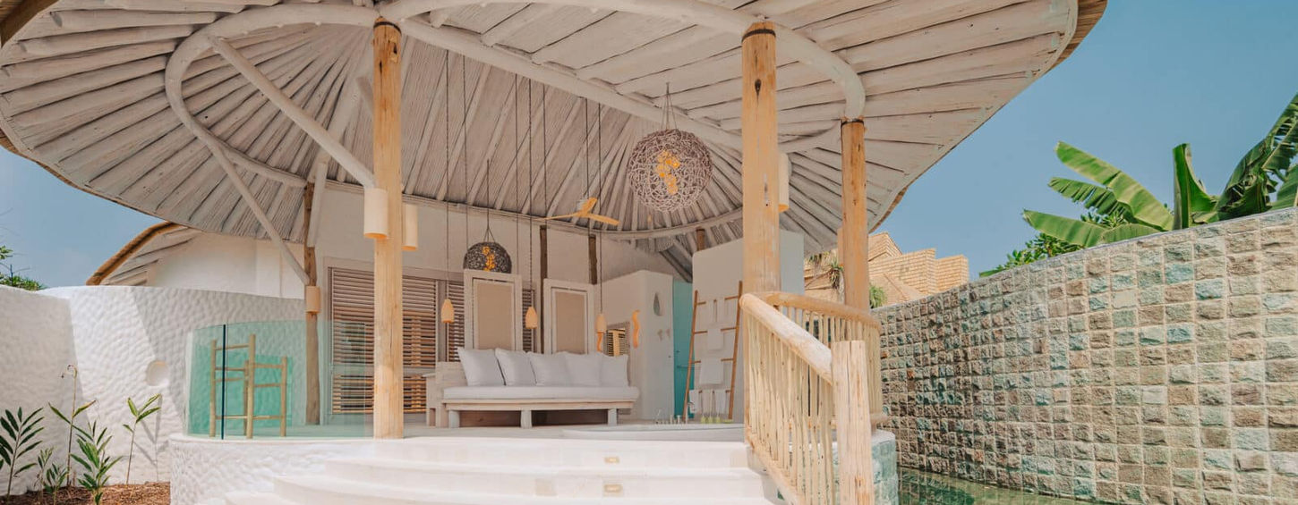 A secluded beachfront haven for families or couples, our Beach Hideaway is tucked among serene mangroves, providing a private escape just steps from the sparkling Indian Ocean. The expansive 5,167 sq.ft. villa features a master bedroom with a retractable roof and an outdoor bathroom surrounded by water, complete with a bathtub and dual showers. Indoors, you'll find a cozy children’s room, a fully equipped kitchen, a gym, and a meditation room, alongside a spacious living area. The wooden terrace, which wraps around a freshwater pool, offers a perfect setting for relaxation. Upstairs, an elevated deck with a dining sala provides stunning views, while an outdoor dining area and yoga champa complete this tranquil retreat.